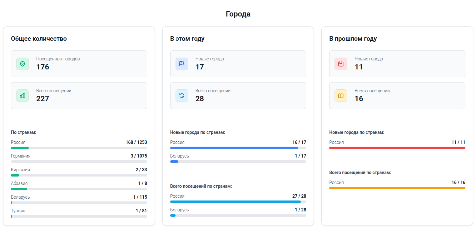 В сервисе доступны все города более чем 20 стран мира. Помимо городов, вы можете просматривать и анализировать регионы и страны, отслеживая свой прогресс на разных уровнях.
