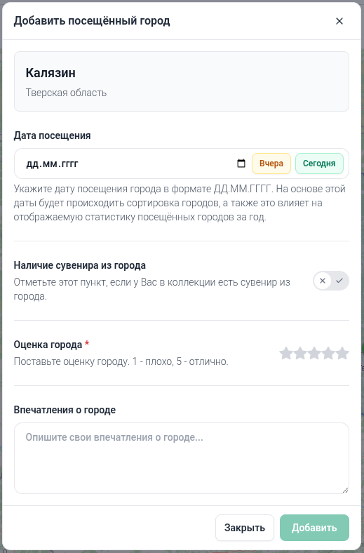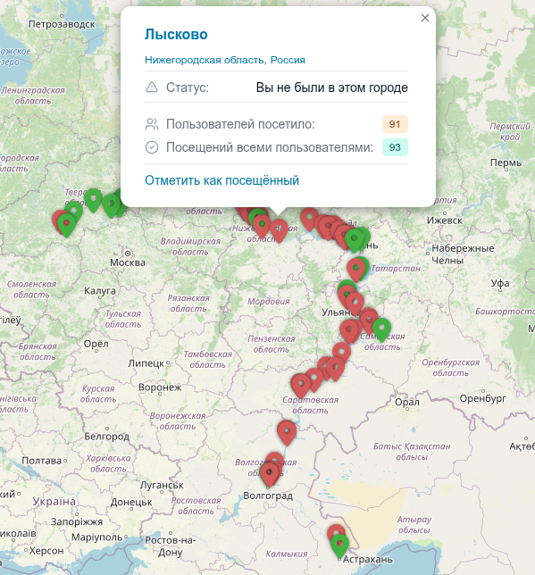 Сегодня этот функционал стал доступен на всех картах 🎉. Теперь отметить посещение можно не только на карте посещённых городов, но и на карте городов региона, а также на карте городов коллекции.
