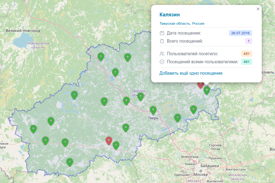 Чтобы добавить посещение, достаточно кликнуть по маркеру города и выбрать «Отметить как посещённый» или «Добавить ещё одно посещение». Откроется знакомая форма добавления города — город и регион будут уже заполнены, останется только указать дату посещения, оценку и наличие сувенира.